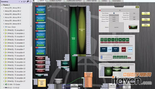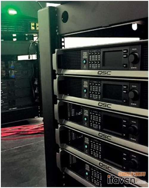 影院服務器通過CAT7網絡電纜和Q-LAN網絡直接連接到核心處理器上。I/O-22接口盒是專門為音頻源和目的地在物理上分開的場所而設計,一對I/O-22接口盒將音頻信號傳輸給QSC四通道網絡數字功放,它們可以安裝在放映機底座內,以節省空間;其它I/O-22提供模擬輸出用于監控和HI/VI(聽覺/視覺受損)音頻。每個影廳都安裝了TSC-3觸摸屏,用于遙控燈光和聲音。