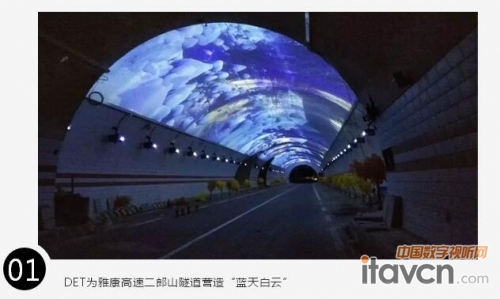 在隧道當中,洞頂采用120臺DET-5U激光類工程機營造出“藍天白云”,緩解視覺疲勞。五星紅旗、紅葉、藍天等圖案交替出現,讓人猶如進入時空隧道,瞬間緩解了長時間駕駛的疲憊感……