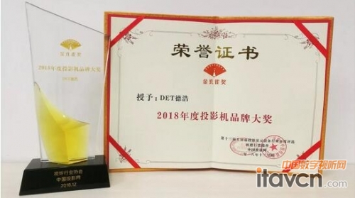 2018年度大屏視聽行業年度評選舉行,DET德浩再次獲得“投影十大品牌”獎項。