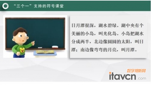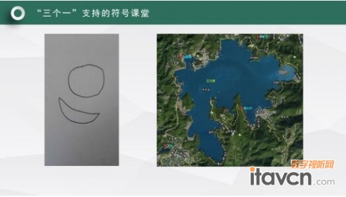 我們老師現在教學借助這樣的一張照片,我們老師可以帶著學生結合剛才的文本,在老師的引領下學生借助多媒體直觀的地圖照片,孩子就能理解日月潭為什么叫做日月潭。