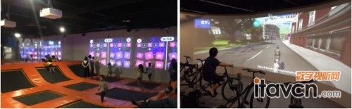 稍大一點的孩子可以參與安裝了兩臺投影機的蹦床游樂項目,通過跳躍并觸摸投影在墻上的正確答案,孩子們互相比賽著解決數學問題。同樣,在安裝了兩臺投影機的Ball Shooting游樂項目中,他們可以用橡膠球擊打投影在墻上的物體而得分。嘗試攀登 項目(使用兩臺投影機)的游客在向頂峰攀登過程中可以體驗投影在攀巖墻上的動畫畫面,而高度沉浸式自行車比賽 項目(使用兩臺投影機)則讓參賽者一路競爭著沖向終點。