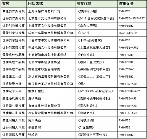 本次影像大賽入圍的40部作品共參與到六大類獎項的角逐中,分別為創作影片獎、紀錄片獎、高校作品獎、創意短片獎、婚禮影片獎和網絡人氣獎。每一大類獎項都評選出了一部最佳獲獎作品和兩部優秀獲獎作品。獲獎團隊同時還獲得了由索尼中國專業系統集團提供的PXW-FS7M2、PXW-FS5M2、PXW- Z280V、PXW-Z90V 等專業攝像機產品,以及愛圖仕、ATOMOS、富士等提供的其他拍攝設備獎品,以此鼓勵影像工作者持續使用索尼專業設備拍攝更多精彩的影片。