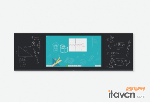 智慧黑板:集交互智能平板與黑板于一體,中間的主屏同時承擔著顯示與書寫功能,兩邊的黑板滿足傳統板書的需要。