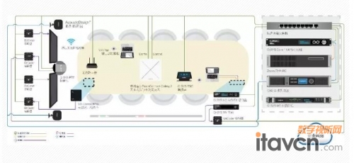 在會議室中,本地高清視頻信號由網絡化分布式視頻傳輸系統Visionary Solutions編解碼設備負責傳輸和路由。同時,Visionary Solutions分布式網絡視頻設備由Q-SYS生態系統控制,通過Q-SYS生態系統與Visionary Solutions的結合,實現了一整套的全網絡化AVC音視頻控制解決方案。