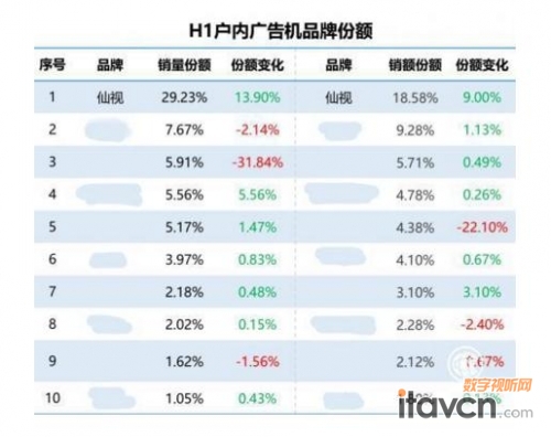 戶內廣告機在2018年爆發式增長后,受傳媒需求下滑影響,上半年銷售減少,受傳媒行業應用減少影響,康佳、長虹等品牌銷量下降較多;仙視銷量較為穩定,與同期相比市場格局將有所變化。