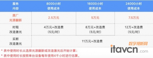 通過上表不難發現,NEC原廠光源翻新的性價比很高。參照使用時長,設備提升亮度后持續運行24000小時(約6年),NEC原廠光源翻新的費用僅7.5萬元,相比時租或買斷的激光改造方式節省了3.5-4.5萬元。