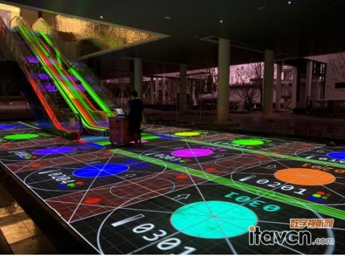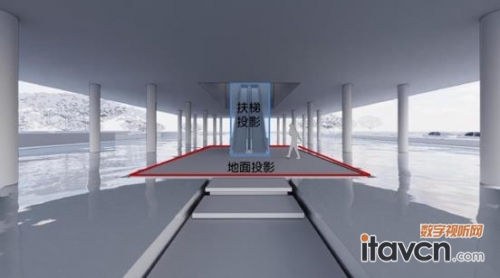 在此項目中,扶梯部分采用5臺松下PT-SMW53C工程投影機,地面部分則采用了13臺松下PT-SMW53C工程投影機,圍繞扶梯進行投射。