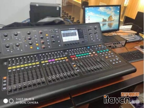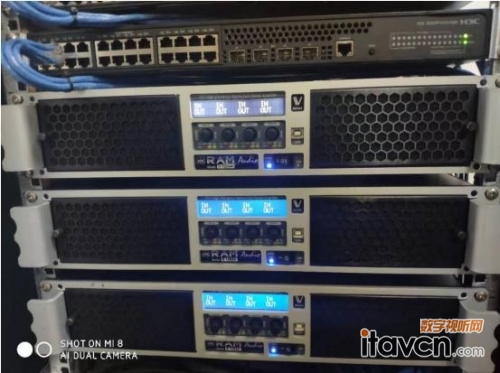 全部PHONIC揚聲器使用了西班牙RAMAUDIO的V12044Dante數字DSP功率放大器進行驅動,V12044Dante是一款四通道大功率數字功放,每通道功率輸出高達2950W/4歐,采用專利的雙QuantaPulse™ 量子脈沖電源供電,內置4x4高精度(56-bit雙浮點)全功能FIR 和IIR DSP處理器,可調整系統分頻、均衡、延時、壓限等,并且配置4路Dante和AES3數字接口,通過RJ45接口,使用RAM OCS Control軟件,操作者可通過網絡遠程監控功放工作狀態,可以說RAMAUDIO的V系列功放是當今世界上最出色的數字網絡功放之一。音響系統配配置了一臺符合調音師習慣的主流品牌MIDAS M32數字臺,整個系統的檔次規格以及先進性都得到使用方的認可。
