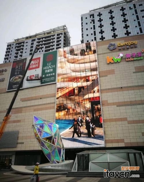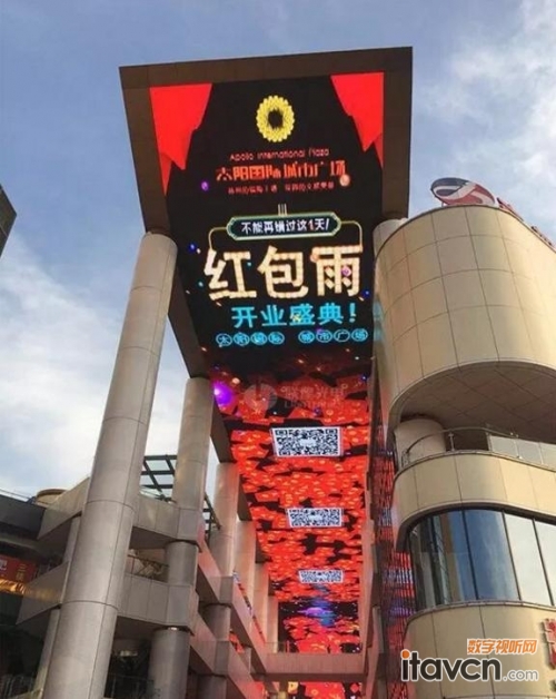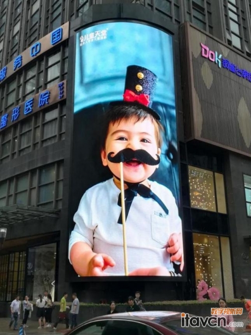 項目采用聯建光電高端節能戶外屏FS6,面積為138㎡,超高的戶外分辨率,8000:1的對比度,是目前五一商圈內最為高清的戶外LED顯示屏;1:1比例的四分之一圓弧設計別具一格,為建筑打開一個生動靈巧的窗口。