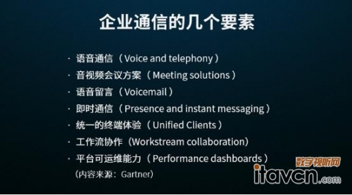 國際知名調研與咨詢機構Gartner在報告里,預測了未來辦公通信的幾大要素:包括語音、視頻通信等基礎通信應用,還有統一的終端體驗、工作流協作等關注企業內部協同的要素,以及平臺的可運維能力等。從報告中可以發現,通信應用走向“融合”是大勢所趨。