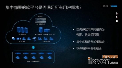 提到云的產(chǎn)品形態(tài),有人認為視頻會議的云平臺形態(tài)應(yīng)該是虛擬化的SAAS軟件,直接集群化部署在通用服務(wù)器上,好處可以隨著技術(shù)的發(fā)展持續(xù)升級。從一個側(cè)面來看,確實如此。但從國內(nèi)政府、大型企業(yè)這些行業(yè)客戶的樹形、層級化的組織架構(gòu)、網(wǎng)絡(luò)現(xiàn)狀以及應(yīng)用需求來看,SAAS軟平臺集中式部署的特點在很多時候并不是最佳的選擇。此外,很多行業(yè)客戶希望視頻系統(tǒng)能夠支撐復(fù)雜應(yīng)用,對媒體集中處理的要求非常高。綜合這些因素,軟平臺和硬平臺各有生存土壤,應(yīng)根據(jù)用戶的實際情況,選擇不同的形態(tài)。