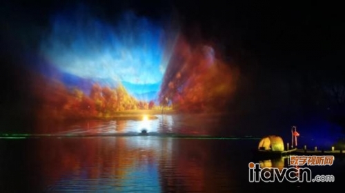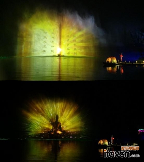 拈花塔利用光影打造了一個禪意空間,拈花湖上也在上演著一幕東方禪意畫卷。由兩臺16,000流明的松下液晶激光系列工程投影機PT-SMZ16KCL,打造的寬22米、高13米的水幕投影,也是這里的代表性項目之一。