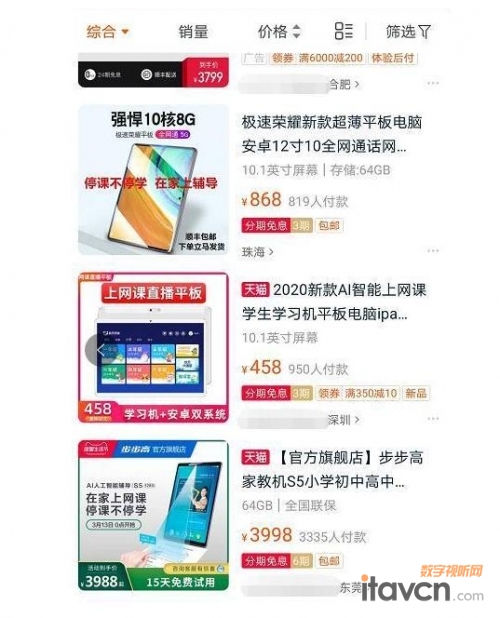 與線下渠道相比,電商平臺上平板、電視的市場地位更占優勢。據了解,部分商家在電商平臺銷售平板時已將在家上網課作為主打功能,廣告語包括“網課就選我”“學習不傷眼”“上網課二合一”等。