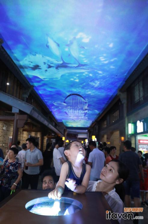 在文化街地下商業部分,美輪美奐的天幕成為一大亮點。21臺NEC PX1004UL+激光工程投影機,采用豎投、融合的投影技術營造出230米超長天幕,帶給市民和游客無限驚喜和遐想。來到地上的戲臺廣場,運用5臺PX803UL+激光工程投影機打造的古戲臺光影秀映入眼簾,在古老戲臺上唱一出科技大戲,凸顯出歷史文化古街的主體特色。