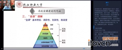 此外,傅教授談到:“高校金課建設(shè)的基本目標(biāo)是建設(shè)一流本科,做強(qiáng)一流專業(yè),推出一流課堂,打造一流師資。而金課具備的基本特征是高階性、創(chuàng)新性、挑戰(zhàn)度。其中‘創(chuàng)新性’強(qiáng)調(diào)的是理念創(chuàng)新、內(nèi)容創(chuàng)新,模式創(chuàng)新、方法創(chuàng)新,形態(tài)創(chuàng)新、過程創(chuàng)新,評價創(chuàng)新、服務(wù)創(chuàng)新。而‘挑戰(zhàn)度’強(qiáng)調(diào)的是深度、難度、內(nèi)涵。”