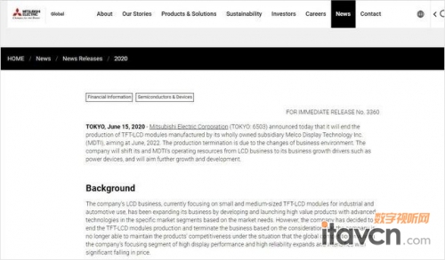 據(jù)三菱電機官網消息,該公司決定退出液晶面板生產,其全資子公司Melco Display Technology Inc.(MDTI) 將于2022年6月結束TFT-LCD模組生產。