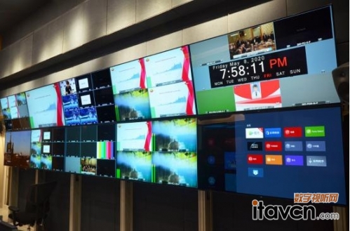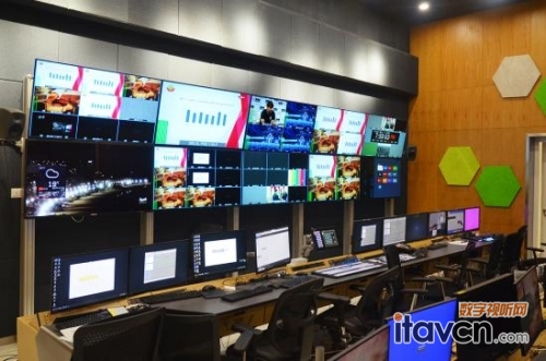 我們首先來到了整個演播制作中心的“中樞神經”——總監控區,這里是所有演播信號與接收信號交匯的中心,18個索尼BRAVIA 4K商用顯示器以2×9的布局,組成了一個超大尺寸顯示墻,管理者和部門領導坐在控制臺前,各個演播室情況一目了然。