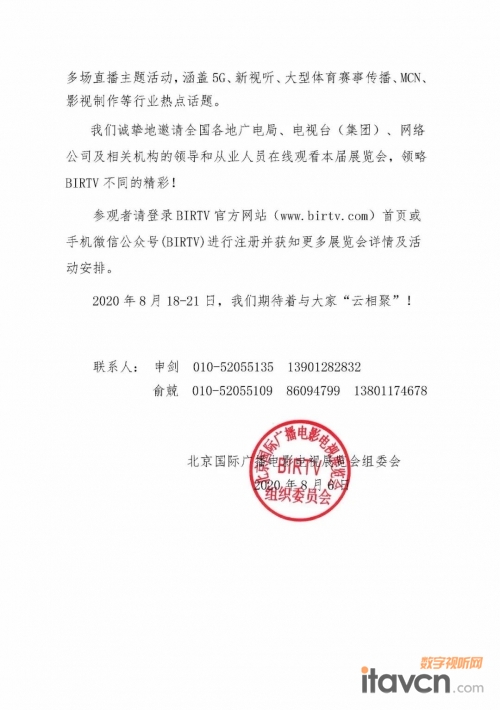 【數(shù)字視聽網(wǎng)訊】《國家廣播電視總局辦公廳關于組織參加第二十九屆北京國際廣播電影電視展覽會(BIRTV2020)線上展的通知》現(xiàn)已公開發(fā)布: