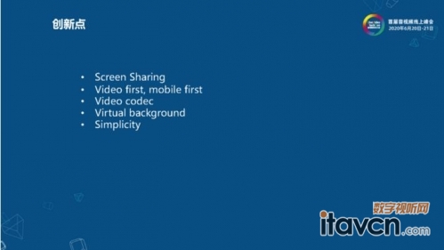 視頻會議2.0的代表公司就是Zoom,這是由一群WebEx的同學(xué)創(chuàng)立的一個公司,誕生在移動互聯(lián)網(wǎng)時代,利用新時代的技術(shù)環(huán)境,包括用戶習(xí)慣的一些改變,再次推動了視頻會議的發(fā)展。WebEx里邊有的功能在Zoom里邊都是有的,Zoom用自己的方式進(jìn)一步進(jìn)行了打磨和提升,在很多細(xì)節(jié)的地方和易用性方面做了很多的提升,除了已有的功能點的打磨,Zoom在這幾個方面也做了很多的創(chuàng)新。