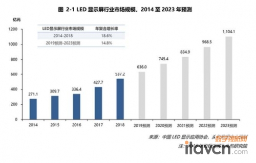 根據頭豹研究院數據顯示,中國 LED 顯示屏行業市場規模從 2014 年的 271.1 億元增長至 2018 年的 537.2 億元,年復合增長率為 18.6%(見圖 2-1)。隨著小間距顯示屏的應用規模進一步擴大,Mini LED 顯示屏、Micro LED 顯示屏逐步實現規模應用,LED 顯示屏行業未來仍有可觀的增長空間。根據頭豹數據預測,中國 LED 顯示屏行業市場規模 2023 年有望增長至 1,104.1 億元,2019 至 2023 年年復合增長率將達 14.8%。