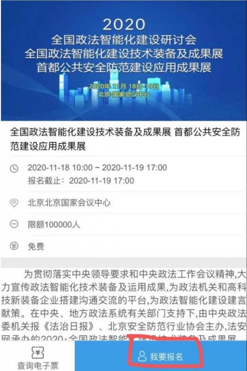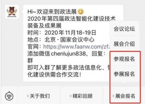 微信關注“全國政法智能化建設技術裝備展”公眾號,點擊首頁底部導航欄內“展會報名”-“參觀報名”-“參展報名”,按要求填寫資料提交即可,如下圖所示: