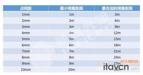 最合適的觀看距離(能顯示高度清晰畫面的距離)= 點間距(mm) ×3000/1000
