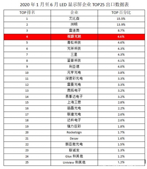 【數字視聽網訊】2020年上半年LED顯示屏企業出口額排行榜新鮮出爐。視爵光旭排在前4名,這不僅僅是一個排名數字,更是實實在在的企業實力。