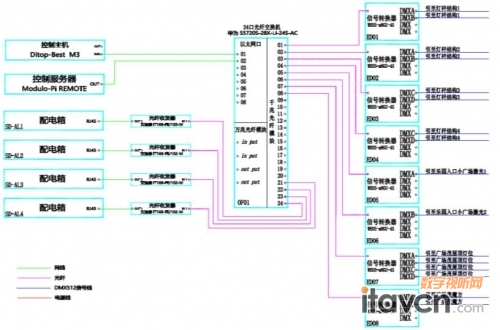 本系統與廣場區通過光纖將兩臺光纖交換機進行連接,通過廣場區的視頻服務器進行控制,將幾個不同區域的燈光系統變成了一個可以進行聯動的燈光系統,燈光控制臺僅在調試時使用,與廣場區相同在燈位處都選擇了光纖版的E/D轉換器。