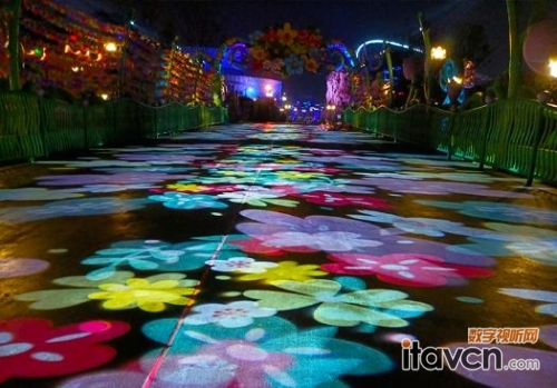 控制系統采用了燈光重放器,將提前錄制好的燈光效果錄入,每日定時開啟與關閉,不需要人員操作,燈具方面一號橋選擇了水紋燈,紫光燈、投影燈,將整個橋面、橋頭以及周邊石頭造型打亮,游客們經過大湖秀之后,來到這里,會看到整個橋面都是花朵,這時游客們進入了奇遇花園。一號橋西綠化帶內除了LED彩虹燈、螢火蟲燈、搖擺螢火蟲燈以外還放置了動物燈雕,在這里游客們仿佛看到了栩栩如生的小動物。