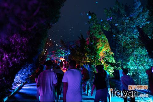 該夜游還設(shè)計(jì)了一處100米長(zhǎng)的林間地面互動(dòng)走廊。走廊兩側(cè)茂密的樹林被燈光渲染上各種不同色彩,地面上是通過(guò)投影機(jī)呈現(xiàn)的海浪、沙灘、花海、游魚等畫面,在影像追蹤系統(tǒng)的作用下,游魚與游客相互追逐,趣味十足。