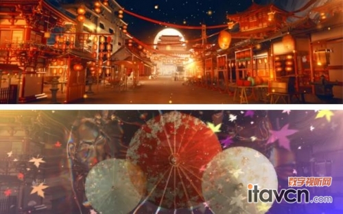 艾迪普充分使用了大量的三維搭建場(chǎng)景,將三維場(chǎng)景與情境融合,展開(kāi)一片古時(shí)夜市燈火輝煌人聲鼎沸的熱鬧景象,同時(shí)大量使用燈籠以及飄帶元素增加節(jié)日氛圍,立體而層次感豐富的三維手段,讓觀眾猶如身臨其境。