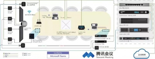 綜合會議系統解決方案采用QSC Core數字音頻處理器作為核心管理系統, QSC CX-Q網絡數字功放、QSC AD-S系列壁掛揚聲器以及森海塞爾TeamConnect Ceiling 2天花式吊頂陣列麥克風、NV-32-H網絡視頻設備、Kramer無線協助系統構建一整套多功能綜合會議解決方案。佳聯綜合會議系統解決方案現已通過Microsoft Teams認證,使Q-SYS生態系統與其完美兼容。現支持成一鍵入會、一鍵參會等功能。并且大大簡化了用戶對會議室控制操作流程。最終達成只需一個控制器即可控制整個會議室。除Microsoft Teams以外,綜合會議系統解決方案還通過了ZOOM以及騰訊會議平臺認證。佳聯全新合作伙伴羅技的出現給綜合會議系統解決方案再添亮點,其簡潔易用的產品特性也為眾多業主提供了更多的選擇。