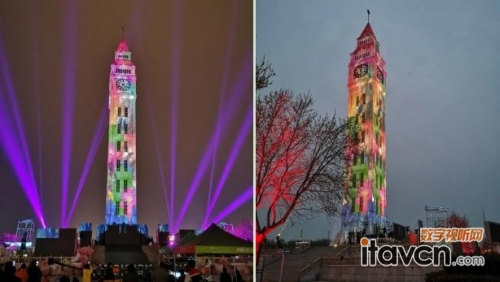 鶴壁鐘樓的周圍安裝了二十臺(tái)科視Christie DWU2022-HS 激光投影機(jī),可用華麗的畫面將整座建筑照亮