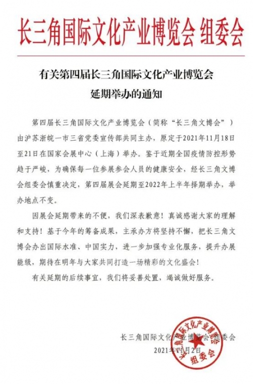 因展會延期帶來的不便,我們深表歉意!真誠感謝大家的理解和支持!基于今年籌備成果,主承辦方將堅持不懈,把長三角文博會辦出國際水準、中國實力,進一步加強專業化服務,提升辦展能級,期待在明年與大家共同打造一場精彩的文化盛會!