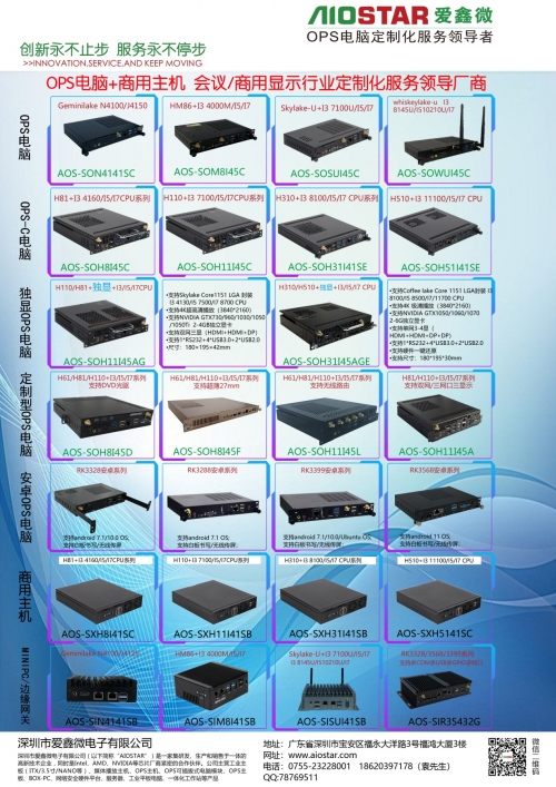 深圳市愛鑫微電子有限公司(以下簡稱“AIOSTAR”)是一家集研發、生產和銷售于一體的高新技術企業,同時是Intel、AMD、NVIDIA等芯片廠 商緊密的合作伙伴。公司主營工業主板(ITX/3.5寸/NANO等)、播放終端、MINI PC、工控機、工業計算機、商用主機、LED會議大屏一體機OPS電腦、獨顯OPS電腦、OPS主機、OPS可插拔式電腦模塊、OPS主板、BOX-PC、網絡安全硬 件平臺、服務器、工業平板電腦、一體化工作站等產品。目前,產品已廣 泛應用于DS、MIDS、IWB、POS、自助查詢、零售金融、工業自動化,智能 交通,網絡信息安全,通訊、智能安防,云計算、石油石化、醫療、軍事 裝備等多個領域。公司高度重視客戶的需求和滿意度,針對不同的客戶需 求,能夠快速做出積極的響應,為其進行量身設計并提供個性化的OEM/OD M服務。