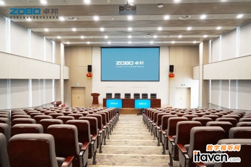 ZOBO卓邦技術團隊根據房間面積及使用需求,通過先進的數字與模擬系統搭建理想的聲場布局設計,采用全頻揚聲器+吸頂揚聲器形式,使得聲場均勻覆蓋整個報告廳,保證會議期間語言清晰和還原度。