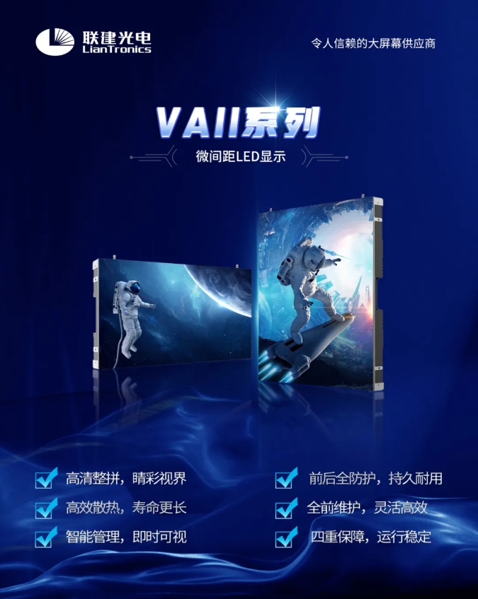 聯(lián)建光電全防護小間距「VAII系列」具有全方位防護、卓越畫質(zhì)等特性,是當之無愧的經(jīng)典爆款。VAII外觀設計炫酷高級,內(nèi)在設計隱藏式把手、防漏光設計、安全倒角、底部防磕碰等,讓使用體驗更流暢;VAII完全前維護,靈動安裝體驗;并且,VAII擁有更加輕薄的箱體、大小雙尺寸、優(yōu)化的成本和豐富的功能配置,適配多樣化用戶需求,包括能源生產(chǎn)、智慧城市、交通樞紐、展廳展示、會議中心等場景,具有全場景適配性。