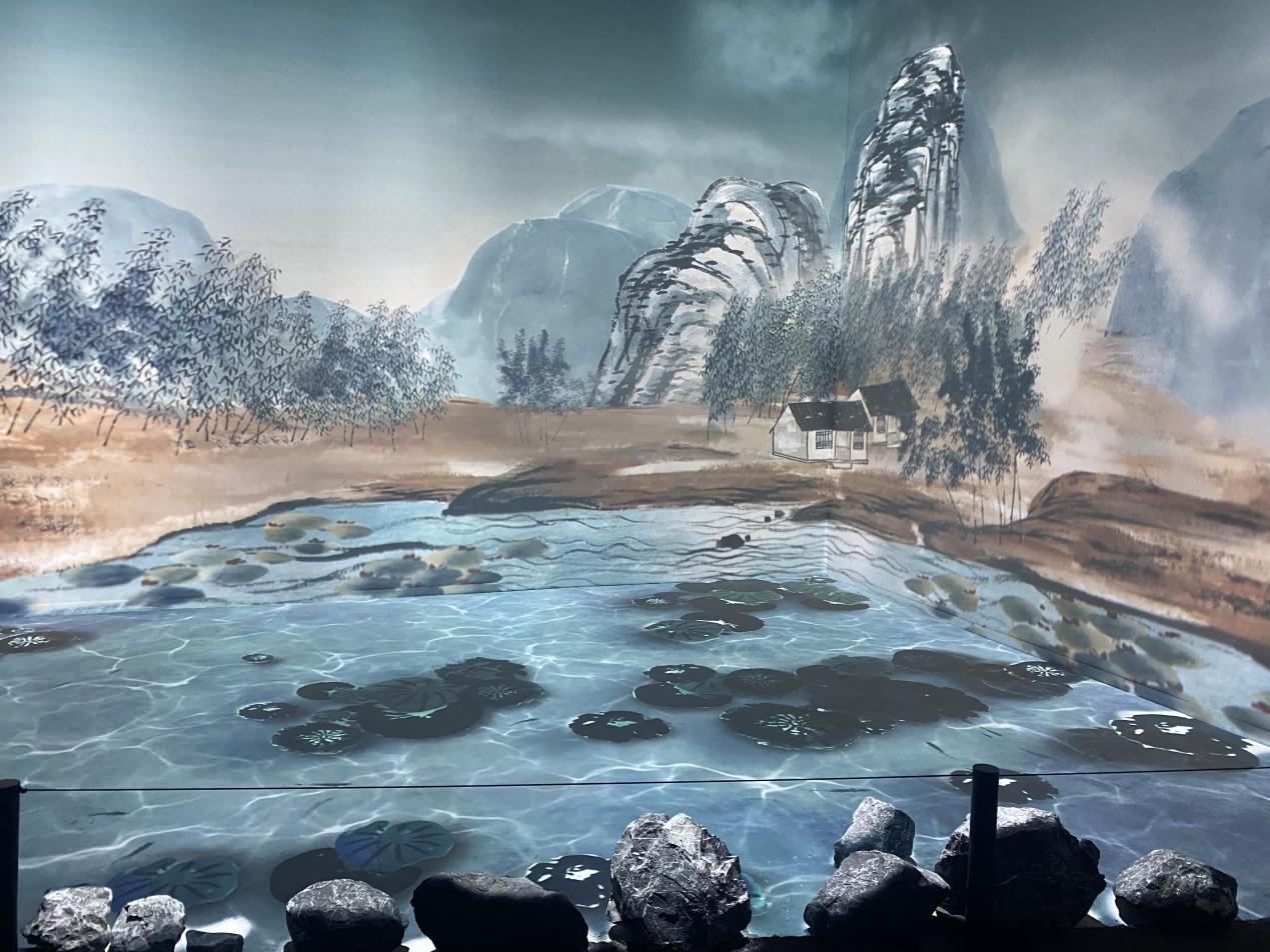 步入《萬竹山居》展區(qū),十余臺極光系列投射出清流潺潺、魚蝦歡游的自然之趣,與竹林、輕霧、木橋虛實相映,傳遞作者的莼鱸之思,營造文人理想的隱居生活。卷軸造型的“畫紙”上,鋪滿光影筆墨,生動描繪白石先生在不惑之年《五出五歸》的經(jīng)歷,繪就“身即山川而取之”的山水大美。《一花一世界》以大師筆下的花鳥魚蟲為藍本,在巨幅折幕中光影再現(xiàn)白石先生蒼勁有力的書法、運筆凝重的花鳥大寫意,致廣大而盡精微,還原白石丹青的天趣畫境。