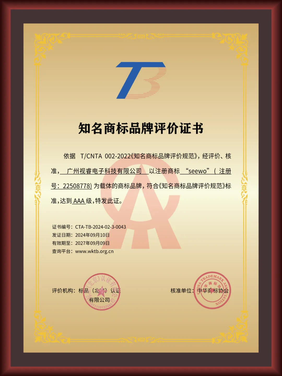 【數字視聽網訊】近日,中華商標協會公布了AAA級知名商標品牌評價公示信息,廣州視睿電子科技有限公司(希沃)的注冊商標“seewo”符合規范要求,通過AAA級知名商標品牌評價,入選成為具有國內外競爭力的AAA級知名商標品牌,這體現了對希沃品牌的高度認可。