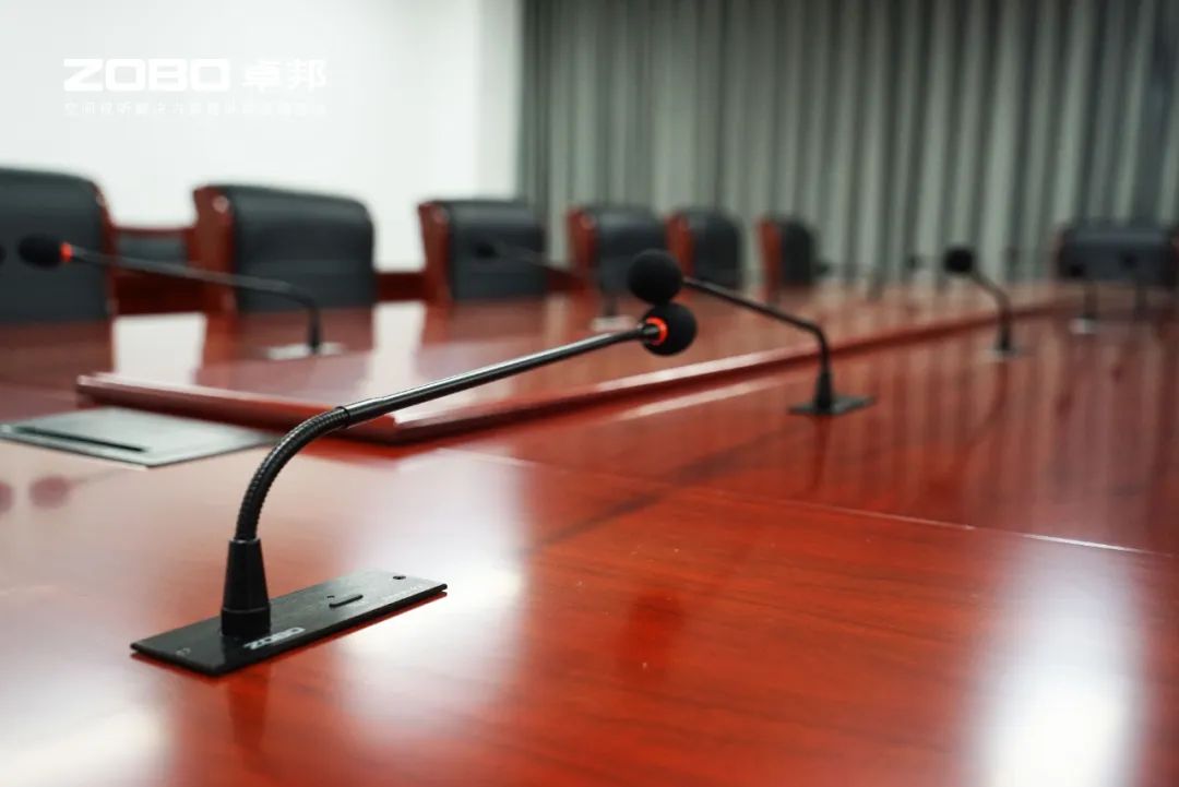 會議室主顯示為一塊98寸高清電視,擴聲系統由主擴音柱和吸頂揚聲器組成,會議發言部分配置ZOBO品牌有線手拉手會議話筒,另配1套無線手持話筒作為流動使用。項目配置ZOBO品牌17套水墨屏會議桌牌,根據與會人員和數量不同,臨時刷新顯示頁面和配置數量。