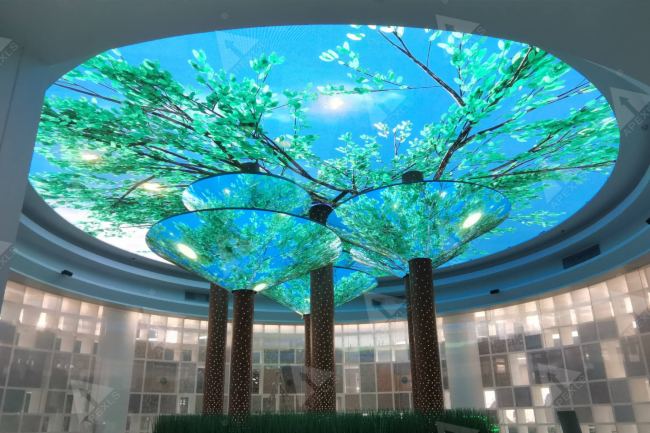 創意LED樹形顯示屏(喇叭屏),采用P6點間距定制,圍繞連接廣場中央的立柱做LED顯示屏包裹,從地面延伸到頂端,由圓柱形到魚缸狀緩緩變化,將上下連為一體,如一個“斗形魚缸”鑲嵌在吾悅廣場室內大廳中間。
