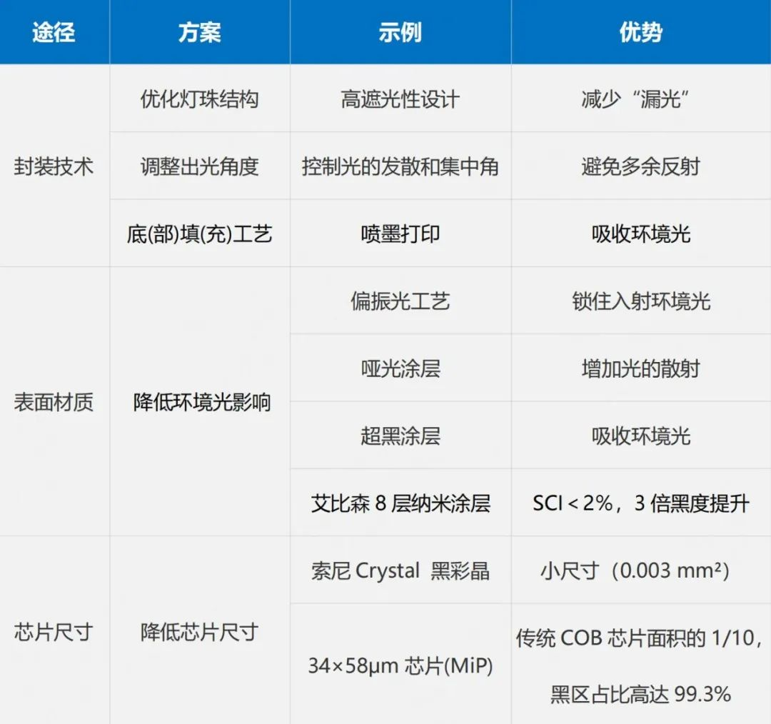 工藝制程決定了LED面板“黑”的極限表現,主要有如下三種提升途徑: