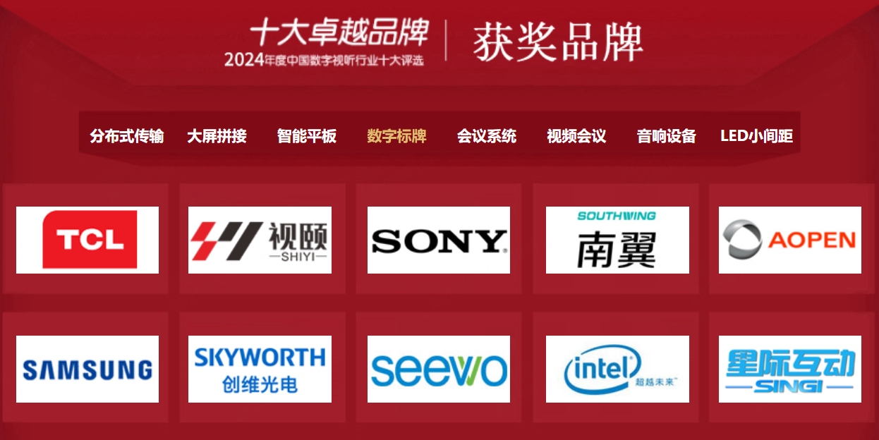 五、榮膺2024年度數(shù)字視聽行業(yè)“數(shù)字標(biāo)牌——十大卓越品牌”榮譽的名單如下: