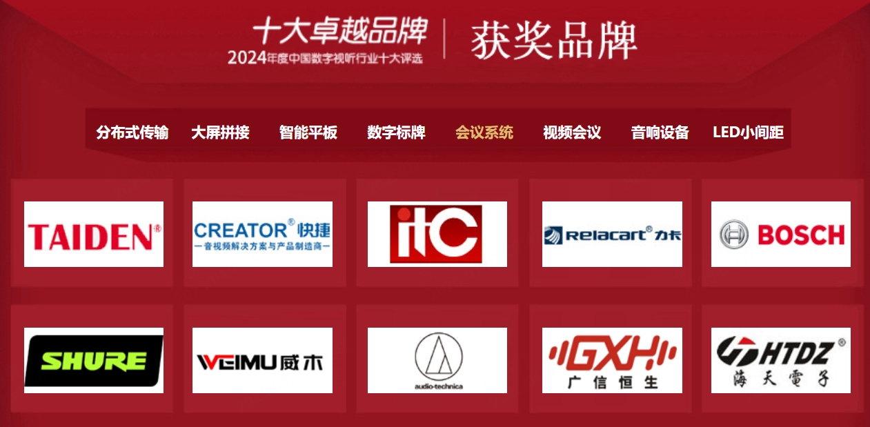 六、榮膺2024年度數(shù)字視聽行業(yè)“會議系統(tǒng)——十大卓越品牌”榮譽的名單如下: