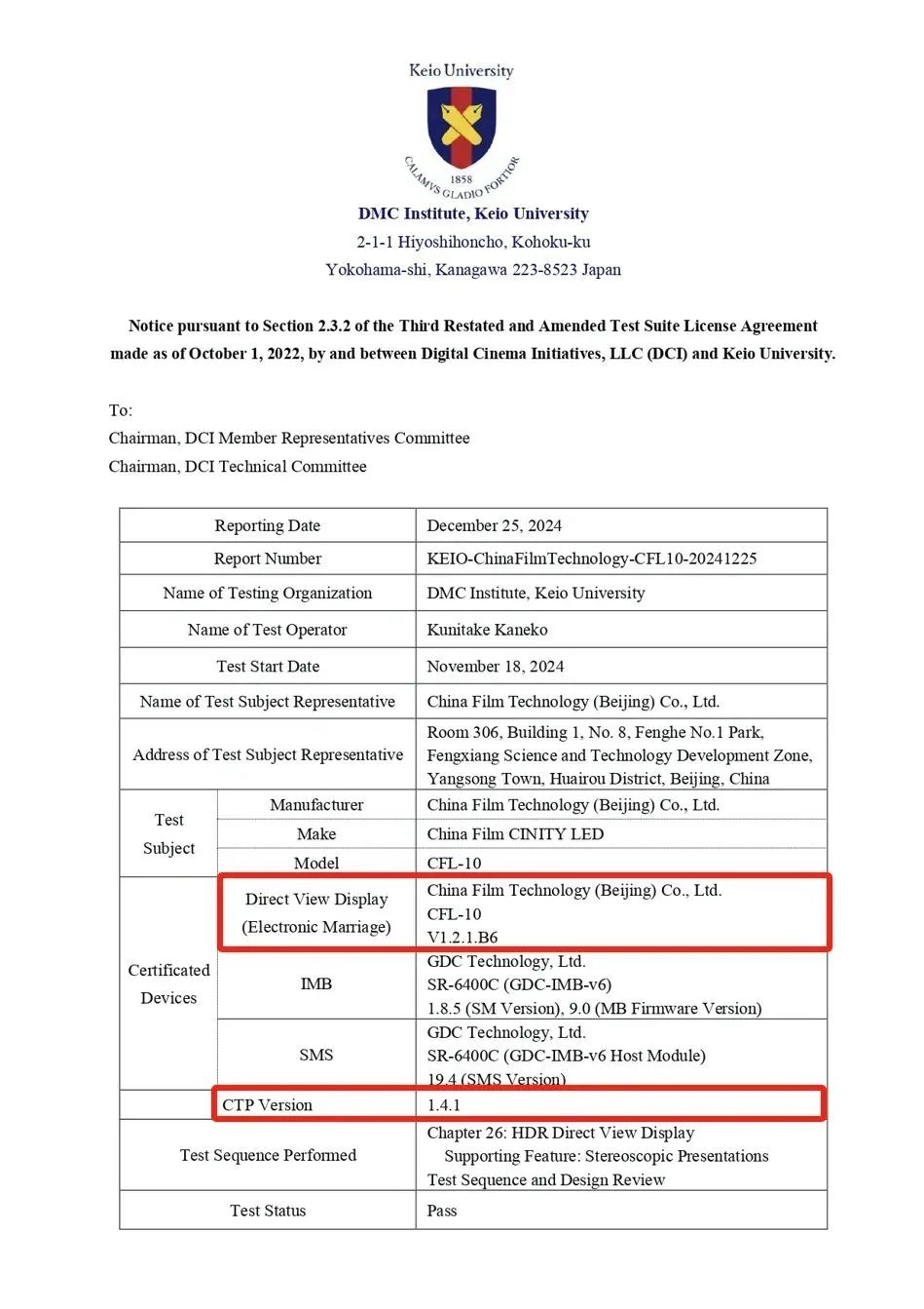 DCI作為全球數(shù)字電影行業(yè)的權(quán)威檢測認(rèn)證機(jī)構(gòu),負(fù)責(zé)制定和更新數(shù)字電影系統(tǒng)的符合性測試認(rèn)證規(guī)范CTP(Compliance Test Plan)。2023年2月,DCI發(fā)布CTP1.3.3,中影CINITY LED CFL-16(16米CINITY LED放映系統(tǒng))則于2023年8月獲得了該檢測認(rèn)證規(guī)范的證書,是全球首款通過此高認(rèn)證標(biāo)準(zhǔn)的LED電影放映系統(tǒng)。隨后,中影科技陸續(xù)獲得了CFL-20、CFL-14、CFL-7等系列LED放映系統(tǒng)的DCI CTP1.3.3認(rèn)證。