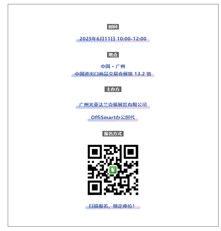 OffiSmart智慧辦公與空間管理高峰論壇將于2025年6月11日首次登陸廣州,以“新質生產力驅動下的辦公生態革新”為主題,攜手領先的辦公軟件企業、數字化解決方案提供商及行業創新力量,共同探討如何通過技術賦能,推動高效、協同、低碳的智慧辦公新生態。