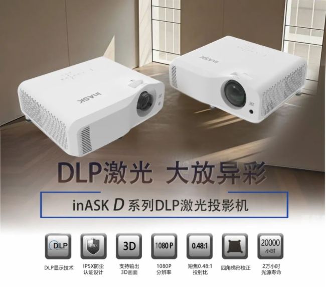 【數字視聽網訊】inASK D系列DLP高清激光投影機,采用高亮激光設計,擁有長短焦投射比兩種機型,4800-5200流明高亮度和高對比度,使畫面靚麗更清晰,基于DLP顯示技術和BrilliantColor標準色彩,為用戶提供更自然真彩畫面。