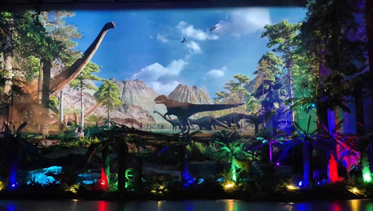 白堊紀恐龍投影區通過六臺科視Christie DWU880-GS投影機構建全景動態場景