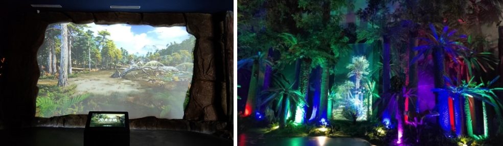入口大廳的熱河生物群投影展示(左圖)及瀑布投影體驗區(右圖)是朝陽市古生物化石博物館的亮點