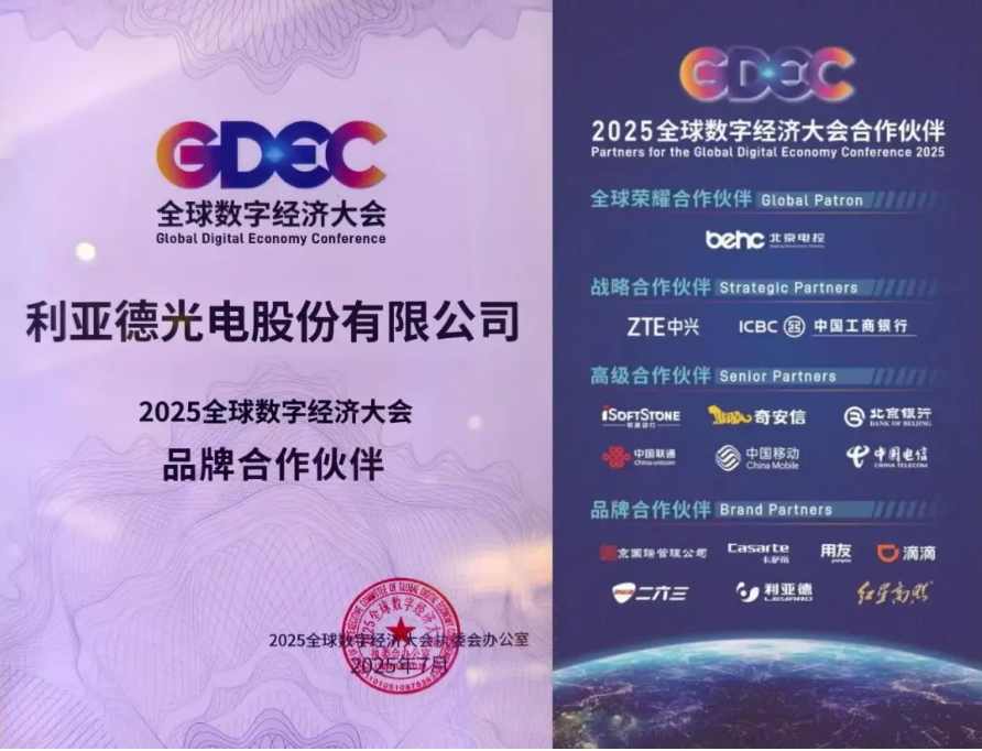 憑借在全球數字經濟大會的突出貢獻及在數字經濟領域的卓越表現,利亞德獲頒“2025全球數字經濟大會品牌合作伙伴”證書,這不僅是對利亞德過往成績的高度認可,更是對其未來在數字經濟領域持續創新發展的激勵。